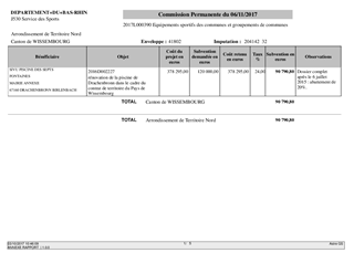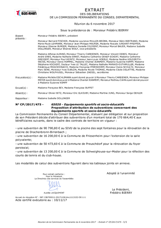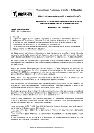 Le présent rapport a pour objet de proposer à la Commission Permanente de décider d'attribuer des subventions, inscrites dans les contrats de territoire, au SIVU de la piscine des sept fontaines de Drachenbronn-Birlenbach et aux Communes de Friesenheim, de Preuschdorf et de Schweighouse-sur-Moder. Ces subventions concernent la construction, la transformation et la mise aux normes d’équipements sportifs et socio-éducatifs.