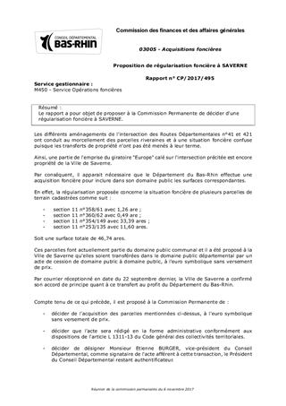Le rapport a pour objet de proposer à la Commission Permanente de décider d'une régularisation foncière à SAVERNE.