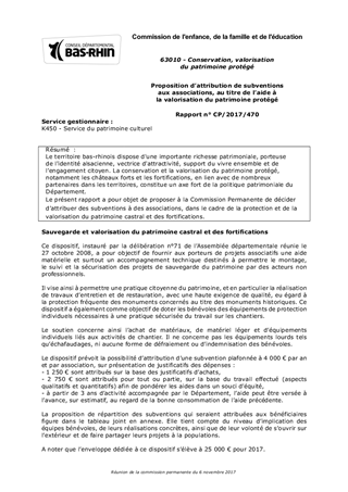 Le territoire bas-rhinois dispose d'une importante richesse patrimoniale, porteuse de l'identité alsacienne, vectrice d'attractivité, support du vivre ensemble et de l’engagement citoyen. La conservation et la valorisation du patrimoine protégé, notamment les châteaux forts et les fortifications, en lien avec de nombreux partenaires dans les territoires, constitue un axe fort de la politique patrimoniale du Département. Le présent rapport a pour objet de proposer à la Commission Permanente de décider d’attribuer des subventions à des associations, dans le cadre de la protection et de la valorisation du patrimoine castral et des fortifications.