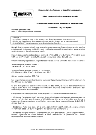 Le présent rapport a pour objet de proposer à la Commission Permanente de décider de l'acquisition de trois parcelles de terrain situées sur le ban communal d'HOHENGOEFT dans le cadre d'une régularisation foncière.