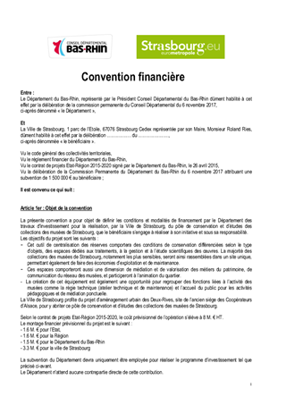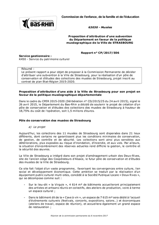 Le présent rapport a pour objet de proposer à la Commission Permanente de décider d'attribuer une subvention à la Ville de Strasbourg, pour la réalisation d'un pôle de conservation et d’études des collections des musées de Strasbourg, projet inscrit au contrat de plan Etat-Région 2015-2020.