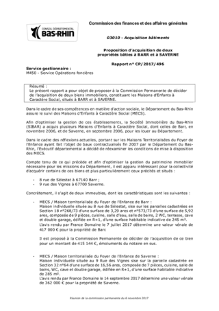 Le présent rapport a pour objet de proposer à la Commission Permanente de décider de l’acquisition de deux biens immobiliers, constituant les Maisons d’Enfants à Caractère Social, situés à BARR et à SAVERNE.