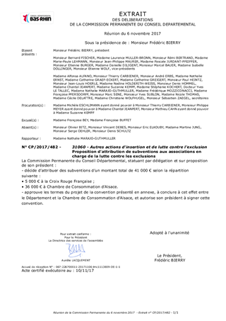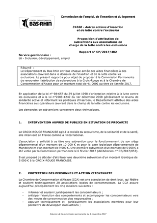 Le Département du Bas-Rhin attribue chaque année des aides financières à des associations œuvrant dans le domaine de l’insertion et de la lutte contre les exclusions. Le présent rapport a pour objet de proposer à la Commission Permanente de renouveler l’attribution de subventions à la Croix-Rouge et à la Chambre de Consommation d’Alsace pour un montant total de 41 000€ uu titre de l'année 2017.
