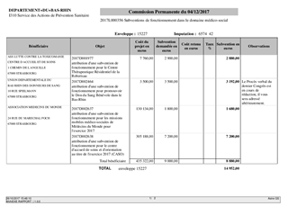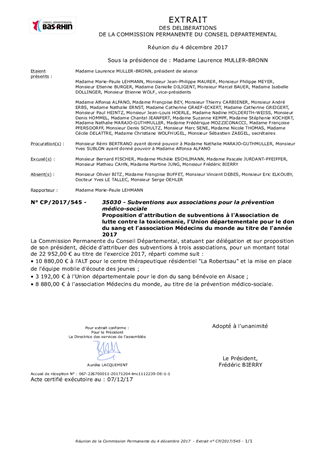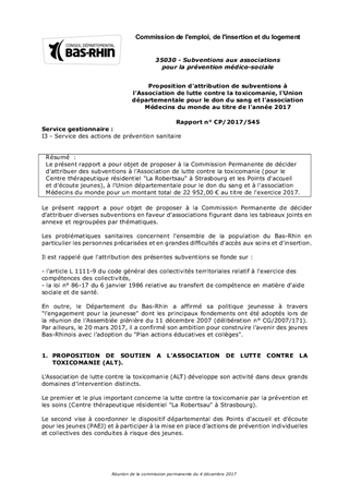 Le présent rapport a pour objet de proposer à la Commission Permanente de décider d'attribuer des subventions à l'Association de lutte contre la toxicomanie (pour le Centre thérapeutique résidentiel "La Robertsau" à Strasbourg et les Points d'accueil et d'écoute jeunes), à l'Union départementale pour le don du sang et à l'association Médecins du monde pour un montant total de 22 952,00 € au titre de l'exercice 2017.