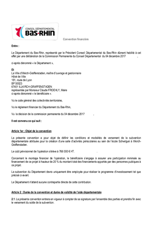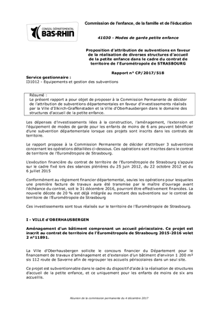 Le présent rapport a pour objet de proposer à la Commission Permanente de décider de l'attribution de subventions départementales en faveur d'investissements réalisés par la Ville d'Illkirch-Graffenstaden et la Ville d'Oberhausbergen dans le domaine des structures d'accueil de la petite enfance.