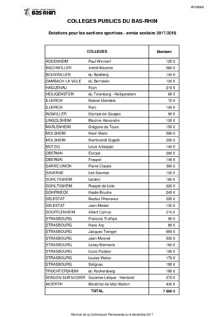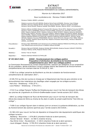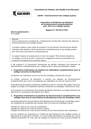 Dans le cadre de ses compétences, le Département du Bas-Rhin attribue des dotations de fonctionnement aux collèges publics. Le présent rapport a pour objet de proposer à la Commission Permanente de décider d'attribuer des dotations de fonctionnement complémentaires à des collèges publics pour faire face à des besoins complémentaires. Ce rapport répond en grande partie à l'axe 2 du rapport "Plan Actions éducatives et Collèges" du 20 mars 2017, concernant l'engagement financier permettant les conditions favorables d'une scolarité réussie.