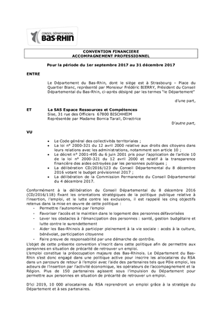 Le Département attribue chaque année des subventions à des structures mettant en œuvre des actions d’accompagnement en faveur des bénéficiaires du Revenu de Solidarité Active (RSA). Le présent rapport a pour objet de proposer à la Commission Permanente de décider d'attribuer une subvention à la Maison de l’Emploi et de la Formation (MEF) du bassin d’emploi de Strasbourg pour son action autour de la Charte Entreprises et Quartiers ainsi qu’à l’Espace Ressources et Compétences pour les actions d’accompagnement linguistique à visée professionnelle. Il est également proposé à la Commission Permanente d'approuver les termes des projets de convention à conclure avec chacune de ces structures.