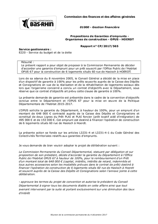 Le présent rapport a pour objet de proposer à la Commission Permanente de décider d’accorder une garantie d’emprunt pour un prêt souscrit par l’Office Public de l’Habitat OPUS 67 pour la construction de 6 logements situés 60 rue de Hasloch à HOERDT.