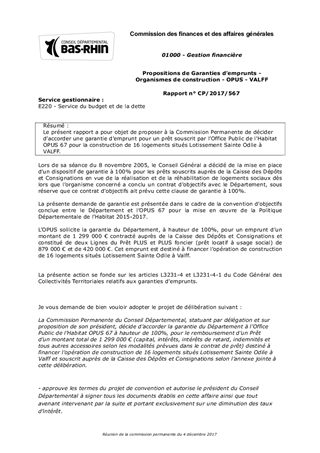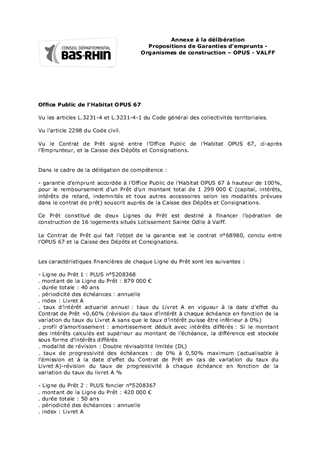 Le présent rapport a pour objet de proposer à la Commission Permanente de décider d’accorder une garantie d’emprunt pour un prêt souscrit par l’Office Public de l’Habitat OPUS 67 pour la construction de 16 logements situés Lotissement Sainte Odile à VALFF.