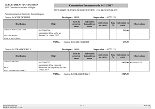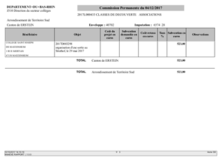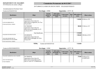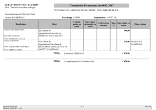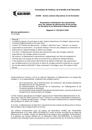 Le présent rapport s'inscrit dans le plan "Actions éducatives et Collèges" approuvé par le Conseil Départemental le 20 mars 2017. L'action 20 "Classes de découverte - collèges", déclinant l'axe 1 "Devenir un citoyen responsable et autonome", se propose d'élargir l'horizon des collégiens en favorisant la découverte et l'apprentissage en dehors du collège. A ce titre, le Département attribue des subventions pour des voyages scolaires organisés par les collèges publics et privés. Par ailleurs, le Département subventionne intégralement les frais de transports et d'entrée pour les classes de 3ème au Struthof et au Mémorial d'Alsace Moselle. Il est proposé à la Commission Permanente de décider d'attribuer des subventions aux collèges publics et privés dans le cadre de voyages scolaires organisés au courant de l'année scolaire 2016/2017. Elles concernent 13 collèges, pour 35 classes et 901 élèves.