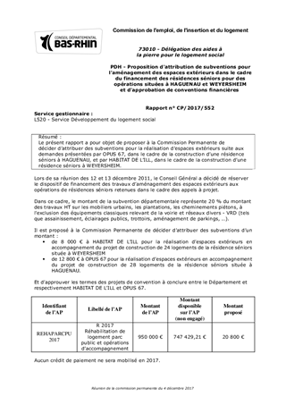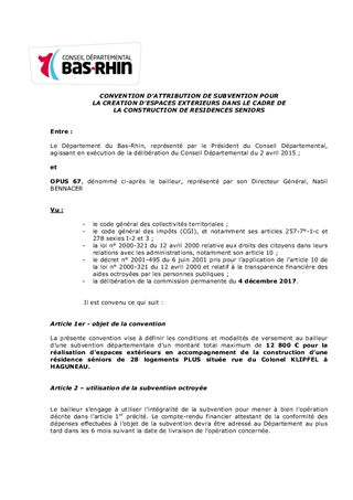 Le présent rapport a pour objet de proposer à la Commission Permanente de décider d’attribuer des subventions pour la réalisation d’espaces extérieurs suite aux demandes présentées par OPUS 67, dans le cadre de la construction d’une résidence séniors à HAGUENAU, et par HABITAT DE L’ILL, dans le cadre de la construction d’une résidence séniors à WEYERSHEIM.
