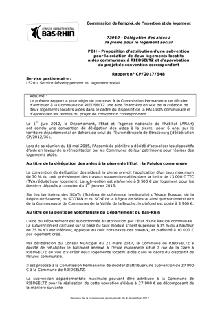 Le présent rapport a pour objet de proposer à la Commission Permanente de décider d’attribuer à la Commune de RIEDSELTZ une aide financière en vue de la création de deux logements locatifs aidés dans le cadre du dispositif de la PALULOS communale et d’approuver les termes du projet de convention correspondant.