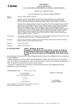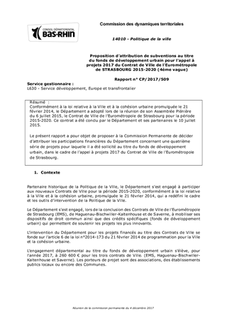 Conformément à la loi relative à la Ville et à la cohésion urbaine promulguée le 21 février 2014, le Département a adopté lors de la réunion de son Assemblée Plénière du 6 juillet 2015, le Contrat de Ville de l’Eurométropole de Strasbourg pour la période 2015-2020. Ce contrat a été conclu par le Département et ses partenaires le 10 juillet 2015. Le présent rapport a pour objet de proposer à la Commission Permanente de décider d’attribuer les participations financières du Département concernant une quatrième série de projets pour laquelle il a été sollicité au titre du fonds de développement urbain, dans le cadre de l’appel à projets 2017 du Contrat de Ville de l’Eurométropole de Strasbourg.
