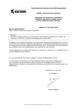 Le présent rapport propose à la Commission Permanente de décider de la cession de véhicules et matériels, propriété du Département du Bas-Rhin.