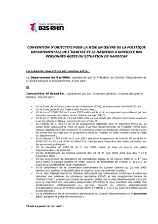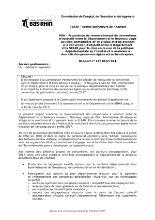 Il est proposé à la Commission Permanente de décider de renouveler la convention liant le Département et trois bailleurs sociaux : le Nouveau Logis de l’Est, Immobilière 3F et Vilogia, pour la mise en œuvre de la politique départementale de l’habitat et le maintien à domicile des personnes âgées ou en situation de handicap. Cette convention de partenariat couvrirait l'année 2017. Il est également proposé à la Commission Permanente de décider d'approuver les termes du projet d'avenant à la convention entre le Département et la SIBAR jusqu'à la fin de l'année 2017.