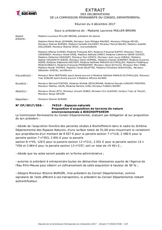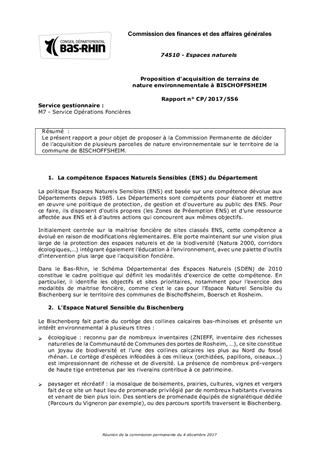 Le présent rapport a pour objet de proposer à la Commission Permanente de décider de l'acquisition de plusieurs parcelles de nature environnementale sur le territoire de la commune de BISCHOFFSHEIM.