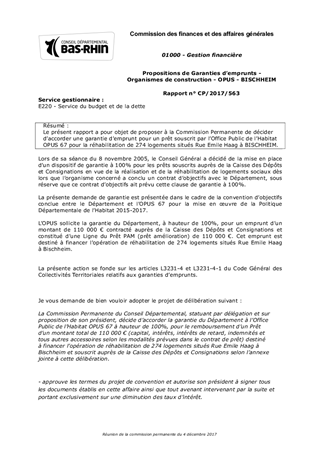 Le présent rapport a pour objet de proposer à la Commission Permanente de décider d’accorder une garantie d’emprunt pour un prêt souscrit par l’Office Public de l’Habitat OPUS 67 pour la réhabilitation de 274 logements situés Rue Emile Haag à BISCHHEIM.