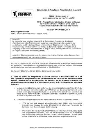 Le rapport a pour objet de proposer à la Commission Permanente de décider d'attribuer des aides financières en faveur de propriétaires privés occupants et/ou bailleurs, au titre de la politique volontariste du Département en faveur de la valorisation du bâti traditionnel bas-rhinois et de l'amélioration de l'habitat privé adoptée par le Conseil Départemental le 20 juin 2016, en complément des subventions de l'Agence nationale de l'habitat (ANAH). A ce titre, 34 projets concernant des logements de propriétaires sont présentés dans les annexes jointes, par territoires d'action.