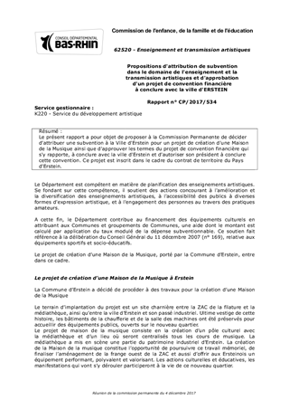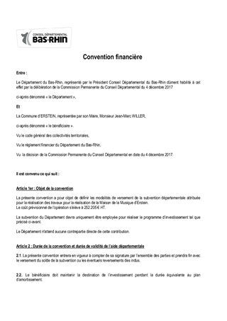 Le présent rapport a pour objet de proposer à la Commission Permanente de décider d'attribuer une subvention à la Ville d'Erstein pour un projet de création d'une Maison de la Musique ainsi que d'approuver les termes du projet de convention financière qui s'y rapporte, à conclure avec la ville d'Erstein et d'autoriser son président à conclure cette convention. Ce projet est inscrit dans le cadre du contrat de territoire du Pays d'Erstein.