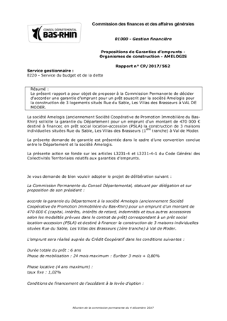 Le présent rapport a pour objet de proposer à la Commission Permanente de décider d’accorder une garantie d’emprunt pour un prêt souscrit par la société Amelogis pour la construction de 3 logements situés Rue du Sable, Les Villas des Brasseurs à VAL DE MODER.