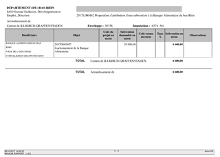 Le Département attribue depuis plusieurs années à la Banque Alimentaire du Bas-Rhin une aide financière annuelle d'un montant de 87 470 €. La Banque Alimentaire contribue à l'insertion professionnelle des allocataires du RSA (16 salariés en insertion en 2016 et 20 en 2017) et à la lutte contre les exclusions (1 828 tonnes de denrées distribuées en 2016), en approvisionnant notamment les 17 épiceries sociales cofinancées. La réglementation européenne, qui exclut les épiceries sociales du bénéfice du Fonds Européen d'Aide aux plus Démunis, et la loi Garot contre le gaspillage alimentaire, ont conduit la Banque Alimentaire à diversifier ses sources d'approvisionnement, induisant un changement d'échelle que les anciens locaux, situés 98, rue de la Plaine des Bouchers à Strasbourg, ne permettaient plus d'absorber. Le présent rapport a pour objet de proposer à la Commission permanente de décider d'approuver l'attribution d'une aide à la prise en charge du nouveau loyer (de 100 000 € à 140 000 € annuels) pour l'année 2017, correspondant à un entrepôt de taille adaptée. Ce déménagement, effectué en octobre 2017, permet d'augmenter la capacité de stockage (de 1 800 m² à 2 800 m²), les flux des camions et le tonnage distribué au bénéfice des publics précaires. Dans ce cadre, il est proposé à la Commission Permanente de décider d'attribuer à la Banque Alimentaire du Bas-Rhin une subvention complémentaire pour l'année 2017.