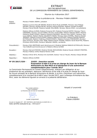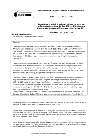 Proposition d'aide à la prise en charge du loyer de la Banque Alimentaire du Bas-Rhin et d'attribution d'une subvention complémentaire pour l'année 2017