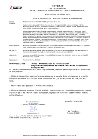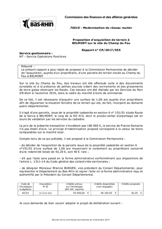 Le présent rapport a pour objet de proposer à la Commission Permanente de décider de l'acquisition, auprès d'un propriétaire, d'une parcelle de terrain située au Champ du Feu à BELMONT.
