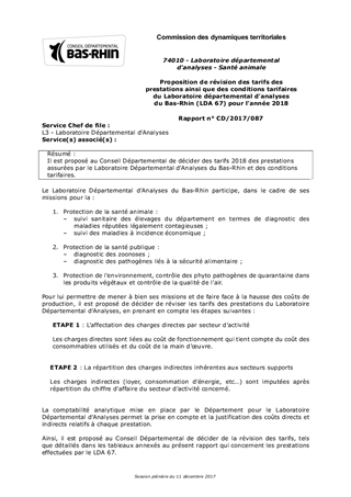Il est proposé au Conseil Départemental de décider des tarifs 2018 des prestations assurées par le Laboratoire Départemental d'Analyses du Bas-Rhin et des conditions tarifaires.