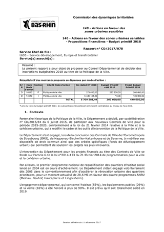 Le présent rapport a pour objet de proposer au Conseil Départemental de décider des inscriptions budgétaires 2018 au titre de la Politique de la Ville.