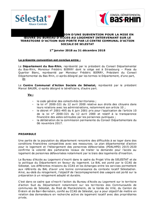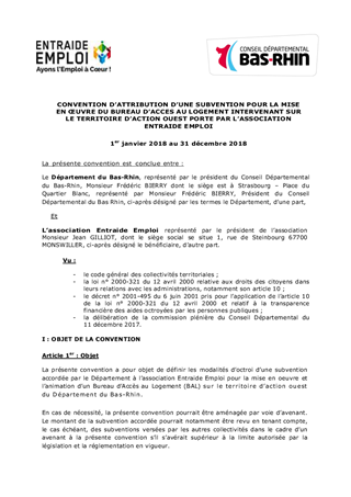 La loi du 31 mai 1990 visant à la mise en œuvre du droit au logement opposable, renforcée par la loi ALUR du 24 mars 2014, consacre le rôle moteur des Départements en faveur de l'accès au logement des publics fragiles, dans le cadre du Plan Départemental d'Action pour le Logement et l'Hébergement des Publics Défavorisés (PDALHPD), co-porté avec l'Etat. Le PDALHPD 2015-2020, adopté par le Conseil Départemental, le 2 novembre 2015 (CD/2015/110), prévoit un ensemble d'actions partenariales visant à favoriser l'accès et le maintien dans le logement des Bas-rhinois les plus en difficulté, à lutter contre la précarité énergétique et à éradiquer l'habitat indigne. Aménageur des solidarités sur tout le territoire bas-rhinois, le Département du Bas-Rhin soutient ou met directement en œuvre de nombreuses actions du PDALHPD. Il est proposé au Conseil Départemental de décider d'inscrire des crédits à hauteur de 3 633 819,78€ pour l'exercice 2018 dont plus de 2,028 millions d'euros pour l'EUROMETROPOLE DE STRASBOURG, au titre du transfert de la gestion du Fonds de solidarité logement (FSL) sur son territoire. Par ailleurs, il est également proposé au Conseil de décider d'attribuer une subvention d'un montant maximal de 26 475 € au Centre communal d'action sociale de la Ville de SELESTAT et une subvention d'un montant maximal de de 33 390€ à l'association Entraide Emploi pour la mise en œuvre de bureaux d'accès au logement sur les territoires d'action Sud et Ouest.