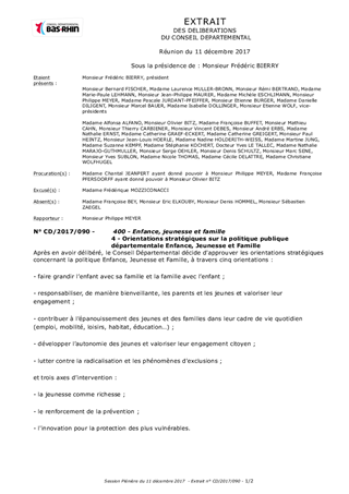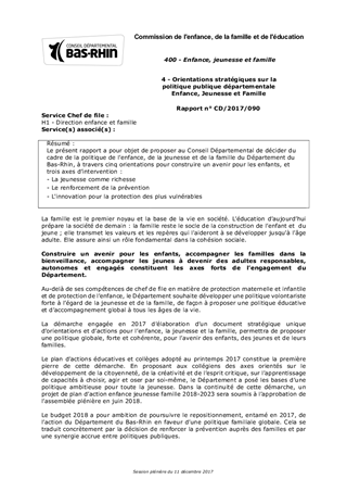 Le présent rapport a pour objet de proposer au Conseil Départemental de décider du cadre de la politique de l’enfance, de la jeunesse et de la famille du Département du Bas-Rhin, à travers cinq orientations pour construire un avenir pour les enfants, et trois axes d’intervention : - La jeunesse comme richesse - Le renforcement de la prévention - L'innovation pour la protection des plus vulnérables