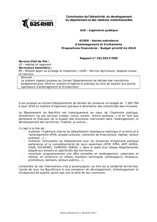 Le présent rapport propose au Conseil Départemental de décider des inscriptions budgétaires pour 2018 en matière d’ingénierie publique au titre du soutien aux autres opérateurs d’aménagement et d’urbanisme.