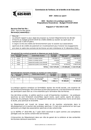 Le présent rapport a pour objet de proposer au Conseil Départemental de décider d'inscrire au budget primitif 2018 les crédits dédiés au soutien au sport pour un montant de 4 164 673,86 €. Il s'agit à la fois de crédits de fonctionnement pour le soutien aux associations sportives et de crédits de paiement en investissement pour honorer les engagements pris dans le cadre des contrats de territoires arrivés à échéance le 31 décembre 2016.