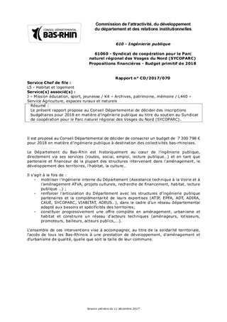 Le présent rapport propose au Conseil Départemental de décider des inscriptions budgétaires pour 2018 en matière d’ingénierie publique au titre du soutien au Syndicat de coopération pour le Parc naturel régional des Vosges du Nord (SYCOPARC).