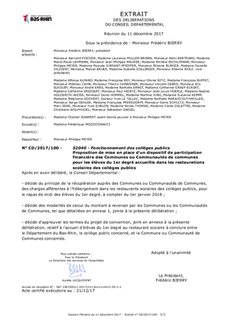 Selon les dispositions définies par la loi du 13 août 2004 le Département assure l’accueil, la restauration, l’hébergement ainsi que l’entretien général et technique, à l’exception des missions d’encadrement et de surveillance, des élèves dans les collèges dont il a la charge. A ce titre, les collèges publics sont chargés de distribuer des repas à l’ensemble des collégiens demi-pensionnaires. Il s’avère que certains élèves du 1er degré bénéficient de cette prestation. Ce rapport a pour objet de proposer au Conseil Départemental de décider de mettre en place un dispositif de récupération des charges incombant au Département au titre d’un service relevant de la compétence communale ou intercommunale, à compter du 1er janvier 2018, et de proposer à l'Assemblée plénière d’approuver le projet de convention type d’hébergement pour le repas de midi d’élèves du 1er degré dans les restaurants scolaires des collèges publics bas-rhinois.