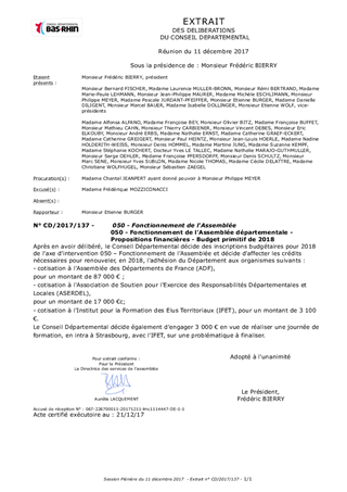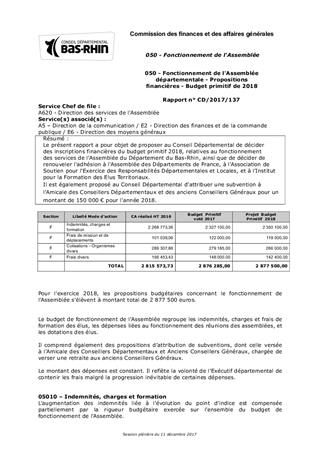 Le présent rapport a pour objet de proposer au Conseil Départemental de décider des inscriptions financières du budget primitif 2018, relatives au fonctionnement des services de l'Assemblée du Département du Bas-Rhin, ainsi que de décider de renouveler l'adhésion à l'Assemblée des Départements de France, à l'Association de Soutien pour l'Exercice des Responsabilités Départementales et Locales, et à l'Institut pour la Formation des Elus Territoriaux. Il est également proposé au Conseil Départemental d'attribuer une subvention à l'Amicale des Conseillers Départementaux et des anciens Conseillers Généraux pour un montant de 150 000 € pour l'année 2018.