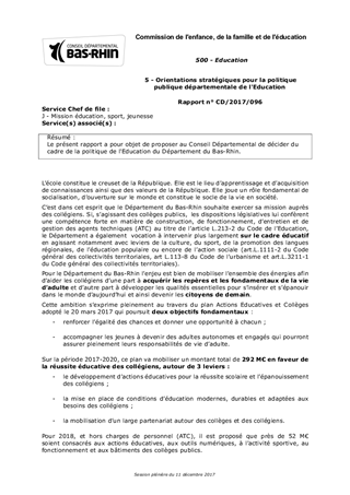 Le présent rapport a pour objet de proposer au Conseil Départemental de décider du cadre de la politique de l'Education du Département du Bas-Rhin.
