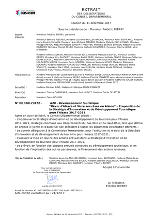Convaincus de la pertinence de l’échelle alsacienne et de l’enjeu fondamental que constitue le développement touristique, les Départements du Bas-Rhin et du Haut-Rhin ont souhaité consolider et élargir leur ambition touristique commune à travers la co-construction d’une Stratégie d’Innovation et de Développement Touristique (SIDT) 2017-2021. Cette ambition partagée constituera un outil de mise en œuvre dans l’ensemble des dimensions de l’économie touristique à l'échelle de l'Alsace. Il est proposé au Conseil Départemental d'approuver le projet de Stratégie d'Innovation et de Développement Touristique 2017-2021 présenté par les Exécutifs du Bas-Rhin et du Haut-Rhin.