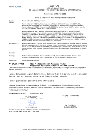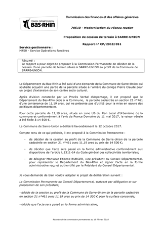 Le rapport a pour objet de proposer à la Commission Permanente de décider de la cession d'une parcelle de terrain située à SARRE-UNION au profit de la Commune de SARRE-UNION.
