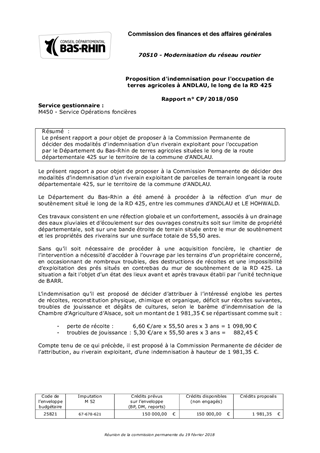 Le présent rapport a pour objet de proposer à la Commission Permanente de décider des modalités d'indemnisation d'un riverain exploitant pour l'occupation par le Département du Bas-Rhin de terres agricoles situées le long de la route départementale 425 sur le territoire de la commune d'ANDLAU.
