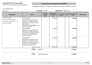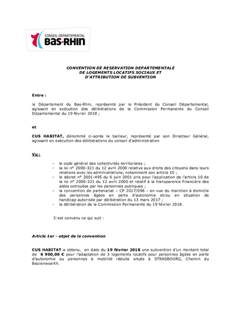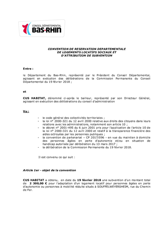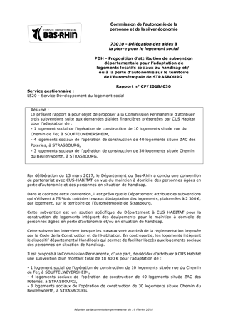 Le présent rapport a pour objet de proposer à la Commission Permanente d’attribuer trois subventions suite aux demandes d’aides financières présentées par CUS Habitat pour l’adaptation de : - 1 logement social de l’opération de construction de 10 logements située rue du Chemin de Fer, à SOUFFELWEYERSHEIM, - 4 logements sociaux de l’opération de construction de 40 logements située ZAC des Poteries, à STRASBOURG, - 3 logements sociaux de l’opération de construction de 30 logements située Chemin du Beulenwoerth, à STRASBOURG.