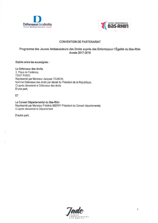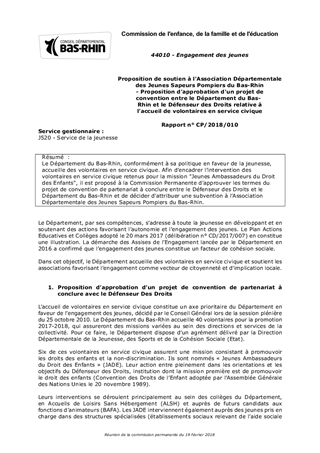 Le Département du Bas-Rhin, conformément à sa politique en faveur de la jeunesse, accueille des volontaires en service civique. Afin d’encadrer l’intervention des volontaires en service civique retenus pour la mission "Jeunes Ambassadeurs du Droit des Enfants", il est proposé à la Commission Permanente d'approuver les termes du projet de convention de partenariat à conclure entre le Défenseur des Droits et le Département du Bas-Rhin et de décider d'attribuer une subvention à l’Association Départementale des Jeunes Sapeurs Pompiers du Bas-Rhin.