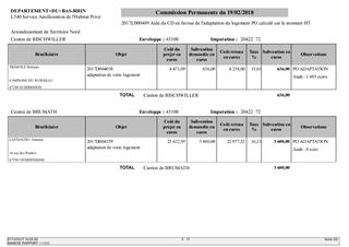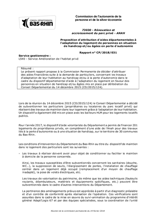 Le présent rapport propose à la Commission Permanente de décider d'attribuer des aides financières suite à la demande de particuliers, concernant les travaux d'adaptation de leur habitation au handicap et/ou à la perte d'autonomie dans le cadre du dispositif départemental d'aide à l'adaptation du logement en faveur des personnes en situation de handicap et/ou âgées mis en place par délibération du Conseil Départemental du 14 décembre 2015 (CD/2015/124).