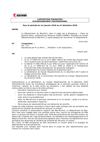 Le Département du Bas-Rhin attribue chaque année des aides financières aux structures en charge de l’accompagnement professionnel des bénéficiaires du Revenu de Solidarité Active (RSA). Le présent rapport a pour objet de proposer à la Commission Permanente de décider de l’attribution de subventions aux opérateurs de l’insertion professionnelle pour 2018. Il est également proposé à la Commission Permanente d'approuver les termes des projets de convention à conclure avec chacune des structures concernées.