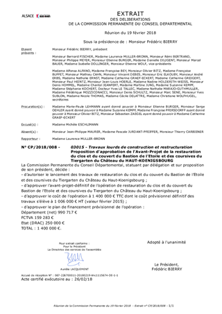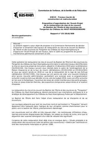 Le présent rapport a pour objet de proposer à la Commission Permanente de décider d'autoriser le lancement des travaux de restauration du clos et du couvert du Bastion de l’Etoile et des coursives du Tiergarten du Château du Haut-Koenigsbourg et d'approuver l'Avant-Projet de ces travaux, dans le cadre du programme de grosse maintenance patrimonial concernant ce site.