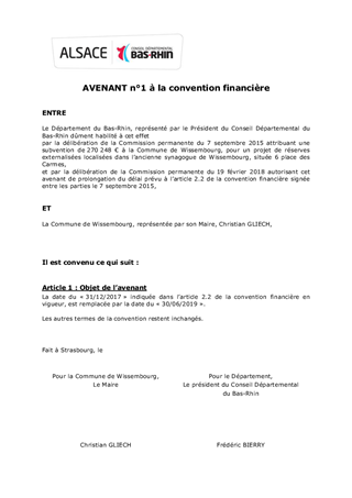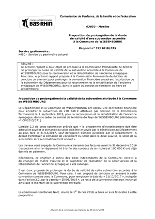 Le présent rapport a pour objet de proposer à la Commission Permanente de décider de prolonger la durée de validité de la subvention accordée à la Commune de WISSEMBOURG pour la reconversion et la réhabilitation de l'ancienne synagogue. Pour cela, le présent rapport propose à la Commission Permanente de décider de conclure un avenant pour prolonger la convention financière encadrant l'attribution de la subvention du Département pour la reconversion et la réhabilitation de l'ancienne synagogue de WISSEMBOURG, dans le cadre du contrat de territoire du Pays de Wissembourg.