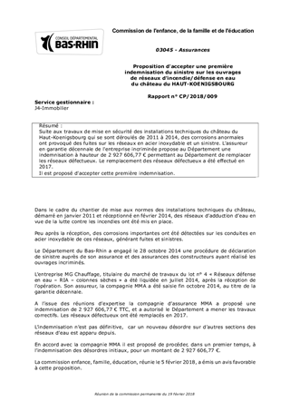 Suite aux travaux de mise en sécurité des installations techniques du château du Haut-Koenigsbourg qui se sont déroulés de 2011 à 2014, des corrosions anormales ont provoqué des fuites sur les réseaux en acier inoxydable et un sinistre. L'assureur en garantie décennale de l'entreprise incriminée propose au Département une indemnisation à hauteur de 2 927 606,77 € permettant au Département de remplacer les réseaux défectueux. Le remplacement des réseaux défectueux a été effectué en 2017. Il est proposé d'accepter cette première indemnisation.