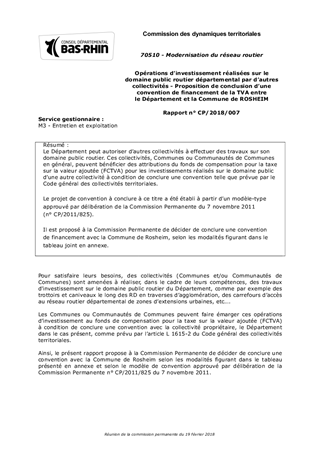 Le Département peut autoriser d’autres collectivités à effectuer des travaux sur son domaine public routier. Ces collectivités, Communes ou Communautés de Communes en général, peuvent bénéficier des attributions du fonds de compensation pour la taxe sur la valeur ajoutée (FCTVA) pour les investissements réalisés sur le domaine public d’une autre collectivité à condition de conclure une convention telle que prévue par le Code général des collectivités territoriales. Le projet de convention à conclure à ce titre a été établi à partir d’un modèle-type approuvé par délibération de la Commission Permanente du 7 novembre 2011 (n° CP/2011/825). Il est proposé à la Commission Permanente de décider de conclure une convention de financement avec la Commune de Rosheim, selon les modalités figurant dans le tableau joint en annexe.