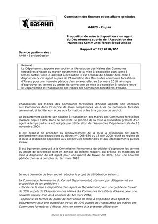 Le Département apporte son soutien à l’Association des Maires des Communes forestières d’Alsace au moyen notamment de la mise à disposition d’un agent à temps partiel. Celle-ci arrivant à expiration, il est proposé de décider de la mise à disposition de cet agent auprès de l’Association des Maires des communes forestières d’Alsace pour une nouvelle période d'un an avec effet au 1er mars 2018, ainsi que d’approuver les termes du projet de convention de mise à disposition à conclure entre le Département et l’Association des Maires des Communes forestières d’Alsace.