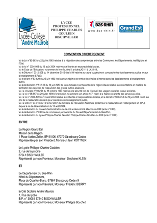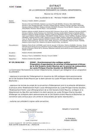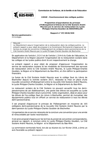 Le Département assure l’organisation de la restauration dans les collèges publics. Le présent rapport a pour objet de proposer à la Commission Permanente d'approuver les termes du projet de convention d’hébergement de collégiens demi-pensionnaires de la Cité Scolaire André Maurois par le Lycée Philippe-Charles Goulden de Bischwiller.